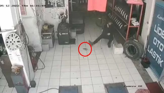 Körfez ilçesinde bir oto lastikçide ilginç görüntüler ortaya çıktı. Çay molasında telefonla konuşan işyeri çalışanı A.H., kendisine doğru farenin yaklaştığını görünce adeta şut çekercesine fareye vurup telefonuyla konuşmaya devam etti. Aynı durum birkaç kez tekrarlandı. Ortaya çıkan ilginç görüntüler anbean işyerinin güvenlik kamerası tarafından kaydedildi.