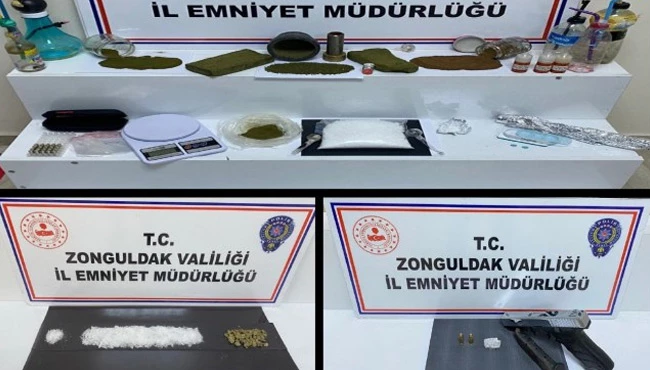 Operasyon çerçevesinde 6 ikamet ve bir iş yeri arandı. Aramalarda 982 gram uyarıcı madde, 509 gram metamfetamin, 4,95 gram esrar, 4,40 gram bonzai, 55 adet şeffaf kilitli poşet, 20 adet 7x65 mm çapında fişek, 9 adet esctasy, 8 adet uyuşturucu kullanma aparatı, 4 adet kenevir tohumu, 3 adet sentetik sıvı solüsyon, 1 adet hassas terazi ele geçirildi.