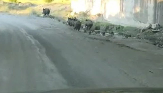 Domuz sürüsünü gören vatandaşlar ise o anları cep telefonları ile kaydetti. Görüntülerde yol kenarındaki domuz sürüsünün araçları görünce koşarak uzaklaştığı görülüyor.