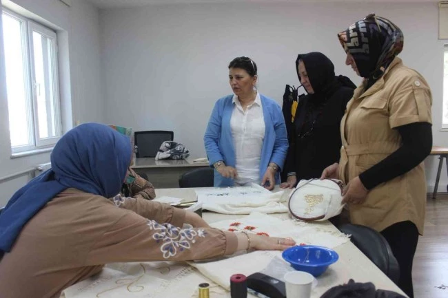 BELMEK kursunda eğitim alan kursiyerler, el emeği ürünler yaparak hünerlerini sergiliyor.