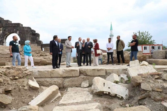 Belediye Başkanı Dr. Faruk Özlü, Kültür Varlıkları ve Müzeler Genel Müdürü Gökhan Yazgı'yı Konuralp bölgesinde Prusias ad Hypium Antik Tiyatrosunda ağırladı.