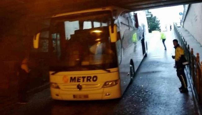Yolcu otobüsü alt geçitte sıkıştı