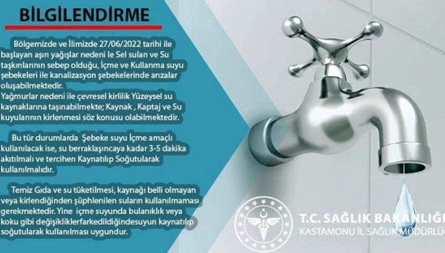 Açıklamada, " Bölgemizde ve İlimizde 27 Haziran'da başlayan aşırı yağışlar nedeniyle sel suları ve su taşkınlarının sebep olduğu, içme ve kullanım suyu şebekeleri ile kanalizasyon şebekelerinde arızalar oluşabilmektedir. Yağmurlar nedeniyle çevresel kirlilik yüzeysel su kaynaklarına taşınabilmekte, kaynak, kaptaj ve su kuyularının kirlenmesi söz konusu olabilmektedir. Bu tür durumlarda Şebeke suyu içme amaçlı kullanılacak ise, su berraklaşıncaya kadar 3-5 dakika akıtılmalı ve tercihen kaynatılıp soğutularak kullanılmalıdır. Temiz gıda ve su tüketilmesi, kaynağı belli olmayan veya kirlendiğinden şüphelenilen suların kullanılmaması gerekmektedir. Yine içme suyunda bulanıklık veya koku gibi değişiklikler fark edildiğinde suyun kaynatılıp soğutularak kullanılması uygundur" denildi.