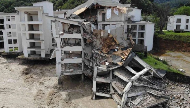 Düzce'de üç gün önce yaşanan yağışların açtığı tahribat gözler önüne seriliyor. Beyköy Beldesi Kalebidi köyü mevkiinde 2016 yılında yapımına başlanılan ve 3 ay sonra açılması planlanan kaplıca oteli, sel felaketinde büyük hasar gördü. Dereye yatığından 40 metre ileriye yapılan otelin bir kısmı yıkılırken büyük bir kısmı hasar gördü.