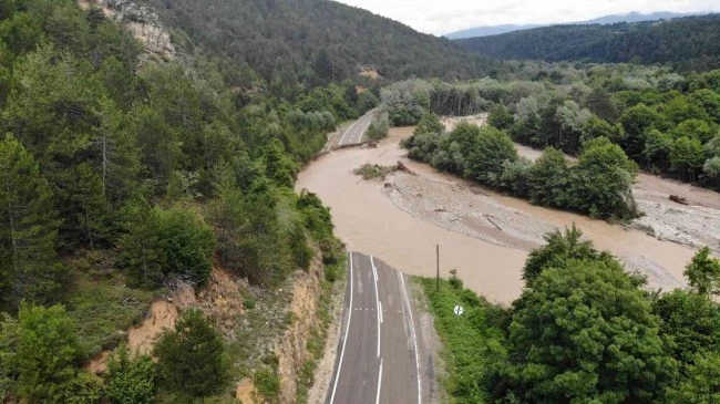 Mengen - Pazarköy yolu üzerinde selin şiddetiyle yıkılan köprüler, çöken yollar ve derelerin içerisini dolduran ağaç ve tomruklar havadan görüntülendi.