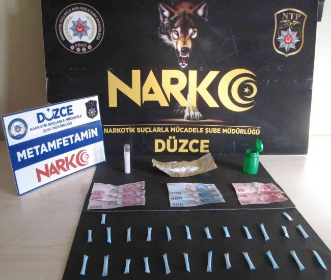 Düzce İl Emniyet Müdürlüğü Narkotik Suçlarla Mücadele Şube Müdürlüğü ekiplerinin Cumhuriyet Başsavcılığı koordinesinde yürüttüğü çalışmada, uyuşturucu madde ticareti yaptığı tespit edilen şüpheli 2 şahıs operasyonla yakalandı. Şahısların üzerinde ve evlerinde yapılan aramada; satışa hazır mavi renkli pipetler içerisinde toplam 55 gram Metamfetamin maddesi, 2 adet sentetik ecza, 16 adet uyuşturucu madde ambalajlanmasında kullanıldığı değerlendirilen plastik pipet ve suçtan elde edildiği değerlendirilen 930 TL para ele geçirildi.