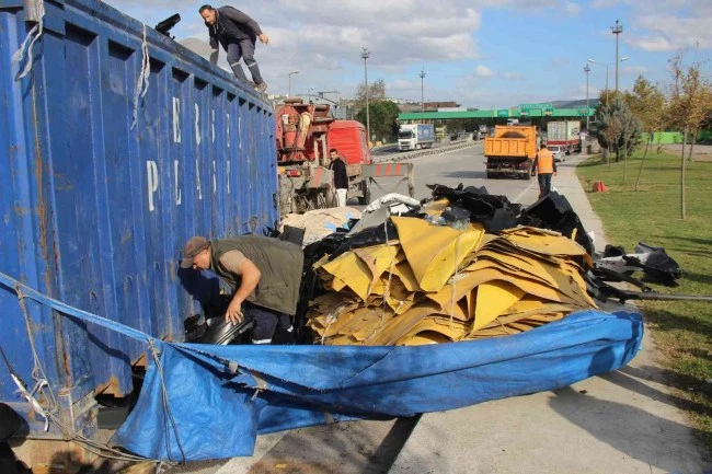 TEM Otoyolu Kocaeli geçişinde hurda yüklü kamyon devrildi. Sürücünün yara almadan kurtulduğu kazada, kamyonda yüklü malzemeler yola saçıldı.