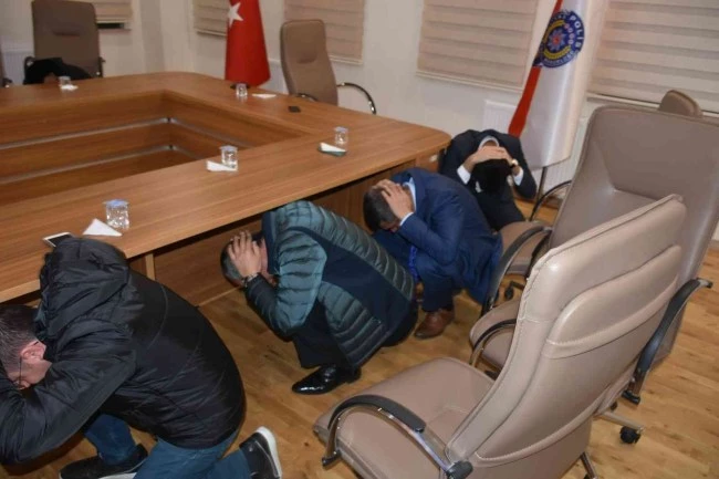 Türkiye genelinde ilk kez uygulanan "çök kapan tutun" tatbikatı, Kastamonu'nun Tosya ilçesinde Hükümet Konağında gerçekleştirildi.