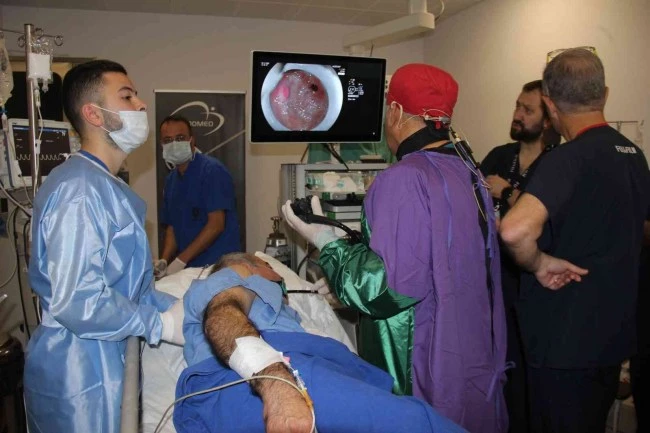 Dış ülkelerden de eğitim için buraya doktorların geldiğini aktaran Prof. Dr. Hülagü, "Tümör şüphesi olan kanalların içerisine girip biyopsi alabiliyor ve uygulama yapabiliyoruz. Safra yollarında kırılamayan büyük taşları lazerlerle kırabiliyoruz. Pankreas kanallarında içeriye kaçan stentleri çıkarabiliyoruz. Tabi ki bunlar çok üst düzey teknik ve uygulamalar. Kanama olan bölgeleri lazerle yakabiliyoruz, müdahale edebiliyoruz. Tümör şüphesi varsa çıkarabiliyoruz. Tabi bunların hepsi erken evre olması gerekli." diye konuştu. Antalya'ya canlı bağlantı kurduklarını söyleyen Hülagü, "Bu canlı yayını 2 bin kişi izledi. Oldukça da başarılı bir uygulama oldu. Bizde sonraki nesil bu eğitim merkezinde bayrak yarışını sürdürecek. Arkadaşlar buradaki yeni teknikleri bizden öğreniyor ve kendi merkezlerinde yapıyor. Irak'tan, Beyrut'tan, Suriye'den Tayvan'dan, Avrupa'dan eğitim için gelen doktorlar var. Onları belli bir program dahilinde kabul ediyoruz. Türk Gastroenteroloji derneğinin Türkiye eğitim merkeziyiz. Onların uygun gördüğü kişileri fakülte ve üniversitelerden 1-2 ay gibi sürelerde eğitim veriyor ve sertifikalarını veriyoruz" şeklinde konuştu.