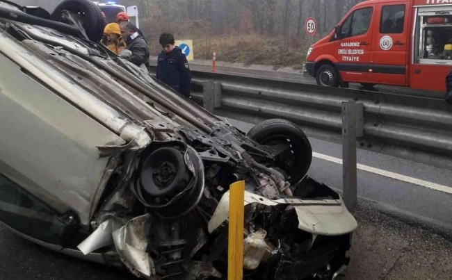 Zonguldak-Ereğli karayolu üzerinde sürücüsünün kontrolünü kaybettiği otomobil yoldan çıkarak orta refüje çarparak ters döndü. Kazada otomobildeki 3 kişi yaralandı.