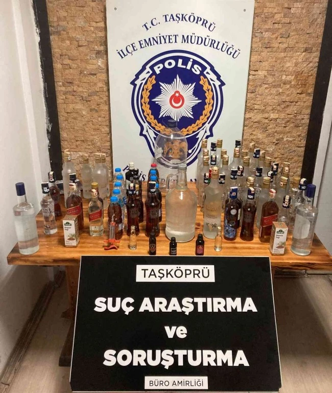 Edinilen bilgiye göre, Taşköprü İlçe Emniyet Müdürlüğü ekipleri sahte alkol bulundurulduğu belirlenen 2 adrese operasyon düzenlendi. Adreslerde yapılan aramalarda 8,5 litre sahte rakı, 7 litre sahte viski, 2 litre etil alkol, 1 adet viski kiti, 1 adet aroma verici, 1 adet anason yağı, 1 adet içki yapımında kullanılan şırınga ve 1 adet alkol kiti ile alkol üretiminde kullanılan düzenekler ele geçirdi.